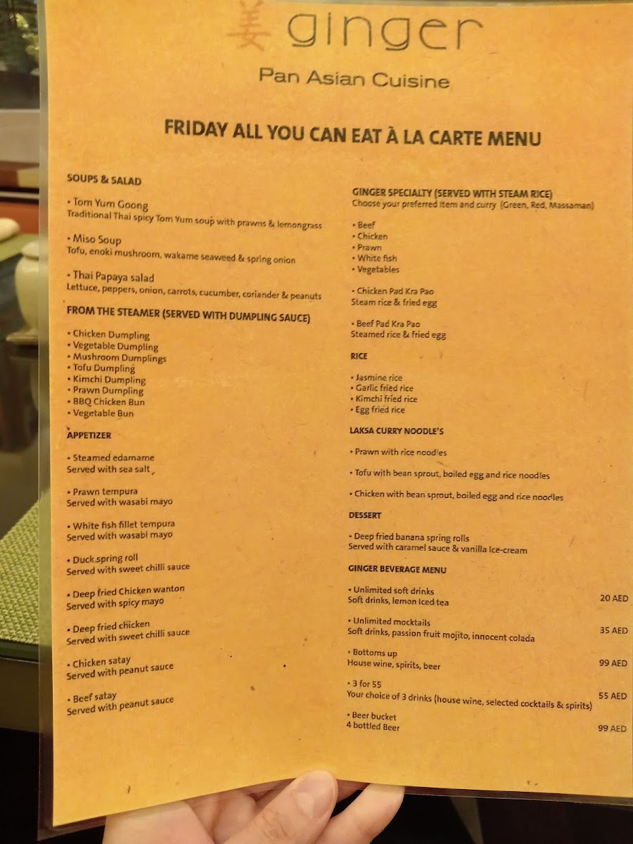 The menu at Ginger Restaurant presents a well-curated culinary journey that balances variety, freshness, and international flair, making it a strong centerpiece of the dining experience at Crowne Plaza Jumeirah. The extensive Sushi Buffet stands out as a highlight, offering a refined selection of Nigiri, Assorted Sushi, Vegetarian Maki, and premium Sushi & Sashimi, all prepared with an emphasis on freshness and clean flavors. Complementing this is the Fresh Seafoods Corner, where guests can enjoy high-quality ingredients such as Lobster and Prawns Roast, delicately cooked Sea Bass, and other ocean-inspired choices that elevate the buffet beyond standard expectations. Asian comfort dishes play an equally important role, with Dumplings and Fried Spring Rolls delivering satisfying textures, while the Chicken Satay with Peanut Sauce adds a rich, smoky depth to the menu. Thai cuisine is well represented through Assorted Thai Food with Shrimp Pad Thai and Panang Curry, alongside aromatic Green Curry, creating a balance of spice, sweetness, and creaminess. For lighter or plant-forward options, the inclusion of Soya Beans, fresh Vegetables, and a well-stocked Salad Bar ensures versatility for different dietary preferences. Smaller bites such as the Sushi Appetizer seamlessly bridge the gap between starters and mains, rounding out the menu with thoughtful pacing. Overall, Ginger Restaurant’s menu succeeds in bringing together diverse Asian flavors and seafood specialties in a cohesive, high-quality offering that feels both indulgent and accessible, leaving a lasting impression through consistency, variety, and careful attention to detail.